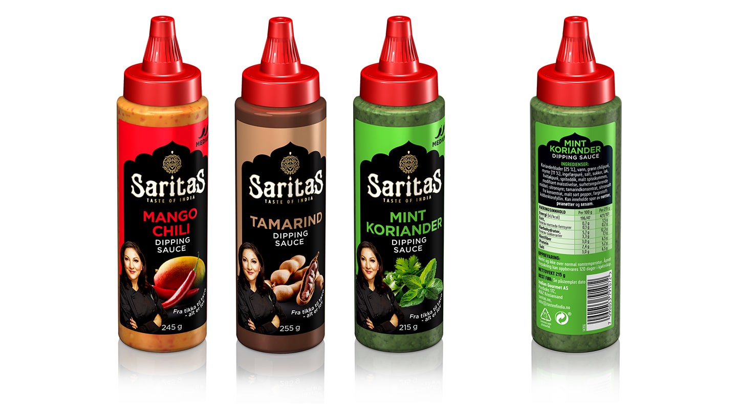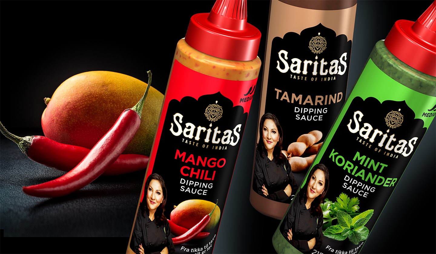 To expand its portfolio, Indian Gourmet decided to launch three flavours of dipping sauces under the Saritas brand. For the labels, we designed a look typical of the Saritas brand, featuring a bold black label with the logo, colour-coded background, and images of the main ingredients of the sauces.