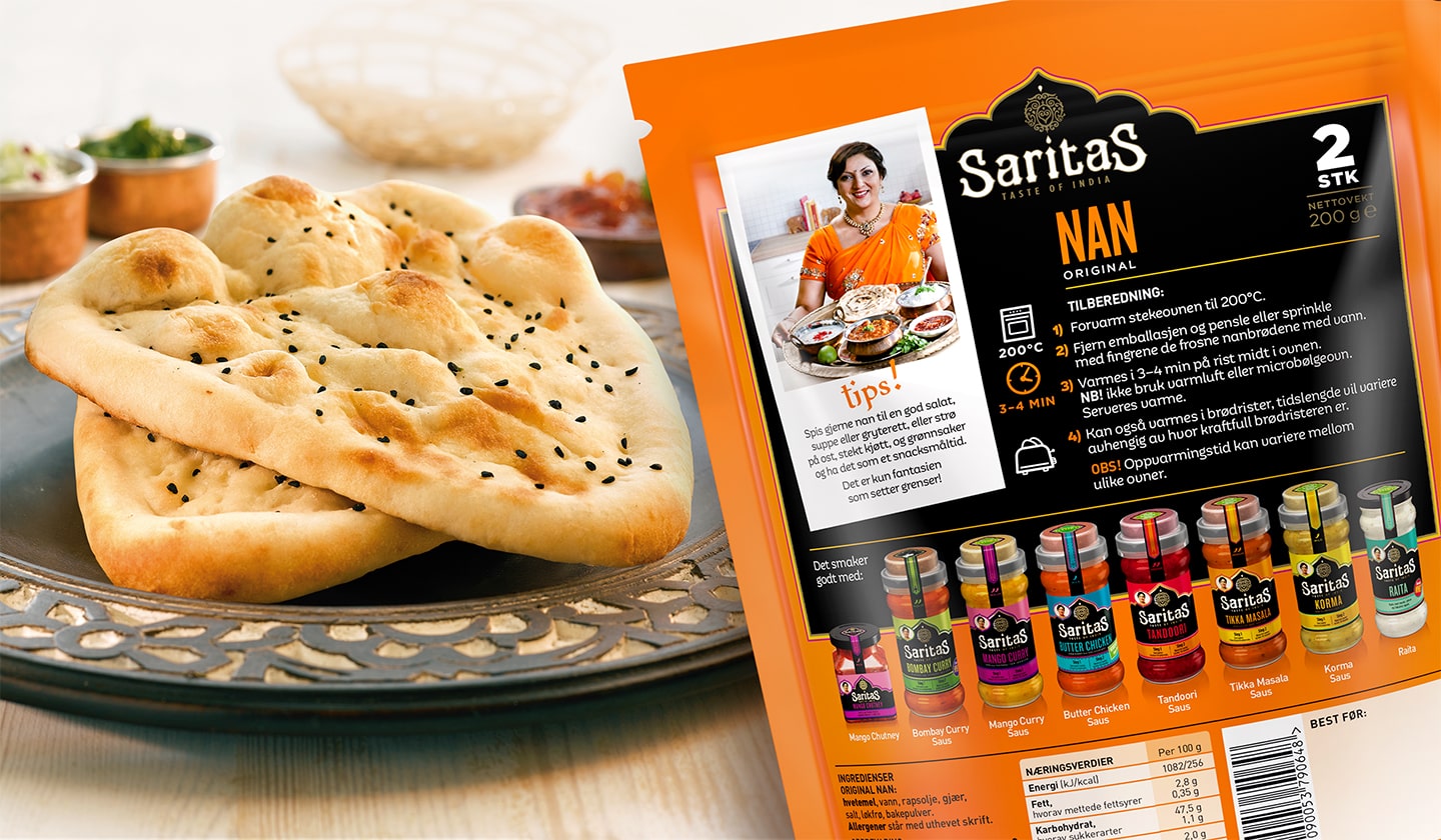 Indian Gourmet has decided to re-launch frozen naan flatbreads under the Saritas brand in two flavour variants, original with sesame and garlic with coriander, and in two pack sizes in early 2025. Both sizes have the same size stand-up pouch with a resealable zipper.