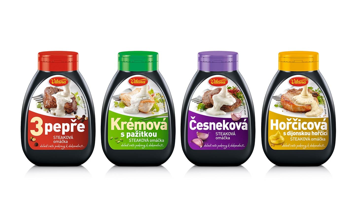 Vitana decided to launch a line of emulsified steak sauces. For this project we helped develop and realise the label design. The quality photo, clear coding of variants and simple typography are the powerful part of the final product.